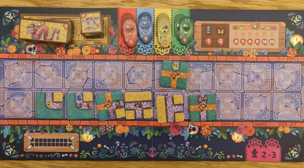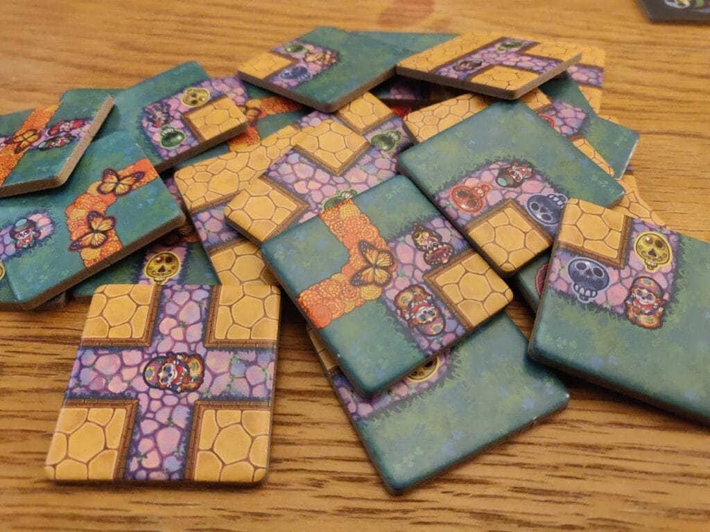 Pour construire chacun notre petit village, nous allons avoir besoin de tuiles. Car oui, Viva Catrina est un jeu de pose de tuiles pour 2 à 6 joueurs, où celui qui aura le plus beau « parque de la muerte » sera le gagnant. Un tour de jeu est extrêmement simple : on choisit une tuile dans une rivière de tuiles (un ensemble de tuiles accessibles) et on la pose sur notre parc, avec pour seule contrainte d’ être adjacente à une autre. Bon, évidemment, on ne va pas les poser au hasard.