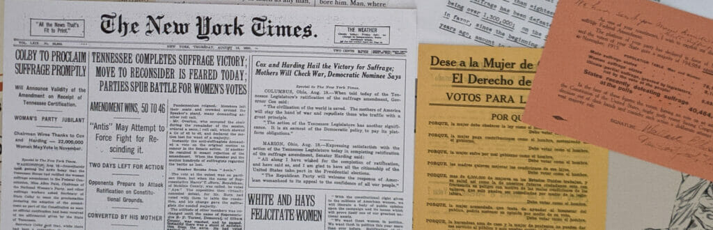 Mais ce qui aide le plus à la fois à reconstituer le contexte de la lutte pour le suffrage universel, à se renseigner de plus près et à s’immerger dans le thème, ce sont les quatorze fac-similés inclus dans la boîte de jeu. On retrouve ainsi des lettres, des tracts, des déclarations d’intention, des bulletins de vote, ainsi qu’une page du New York Times dans laquelle T. Brown a rassemblé tous les articles sur l’obtention du droit de vote par les femmes, après la ratification du 19e amendement par l’État du Tennessee.