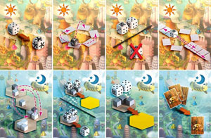 Le tour de jeu est comme souvent divisé en étapes. Vous avez d’abord la phase d’assignation : les joueurs lancent leurs 6 dés (leurs abeilles) et les assignent à des actions. Dès que tous les dés ont été assignés, la carte « nuit & jour » de premier joueur est retournée pour indiquer le début de la phase de résolution. Jetons un oeil sur les actions possibles…