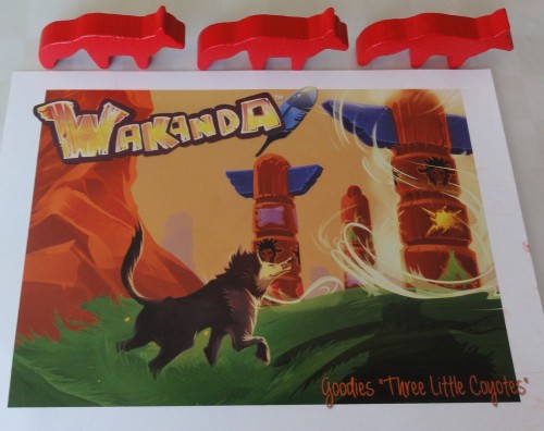 Les différents villages ne sont pas équivalents en terme de potentiel et de prise de risque, mais celà n’est pas gênant puisque le mécanisme intègre une balance de manière native, en associant le village et les corps de totems rattachés. La bonne connaissance de ces valeurs relatives octroie cependant une grosse longueur d’avance au joueur expérimenté face au débutant, ce qui de mon point de vue est une qualité pour un jeu. Les lecteurs les plus attentifs auront noté que le nombre de corps de totems est impair : 21. Comme le tour d’un joueur commence invariablement par en piocher un, le fait est que le premier joueur en piochera 16 en tout, contre 15 au second. | Mignons tout plein, ces « Three Little Coyotes » apportent un niveau de réflexion supplémentaire qui chamboule sensiblement le jeu avec pas moins de 9PV à la clé dans le meilleur des cas. L’obligation de déplacer un coyote s’il est possible de le faire est bien vicelarde. C’est un bonus qui a le mérite d’exister et qui pourra pimenter vos parties le jour où vous penserez être venu à bout du jeu. J’ai toutefois eu tendance à trouver cette surcouche plutôt dispensable, le jeu de base se suffisant déjà largement à lui-même question nœud au cerveau. |