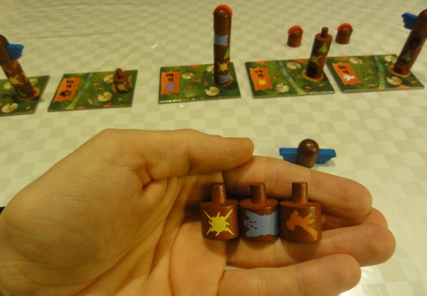 Sans le recul d’une ou deux parties, on ne maitrise pas vraiment encore les tenants et aboutissants. Ce village des Peaux qui me tente est-il vraiment une bonne affaire, ou serait-ce jouer le jeu de mon adversaire ? Quoiqu’il en soit, la tension monte rapidement avec l’enjeu. Le choix s’élargit progressivement lui aussi : à chaque coiffe posée, on conserve un corps de totem en plus en main, ce qui agrandit l’éventail des possibles.