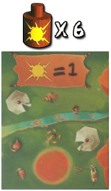 Lorsque ce village est de sortie, les corps Soleils sont donc neutres en terme de scoring, sauf par rapport aux deux villages spéciaux (voir ci-dessous). Le village en lui même, par contre, « vaut » quasi systématiquement (sauf rétention de Soleil en main) l’équivalent en différentiel de 12PV, ce qui en fait un must. S’il se retrouve écarté, l’équation est complètement différente : les Soleils deviennent réellement des malus à éviter et donc à placer malicieusement. La variante expert (j’y reviendrai) laisse d’ailleurs une incertitude sur ce facteur si le village ne sort pas d’emblée. Les deux villages spéciaux