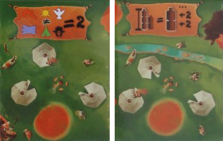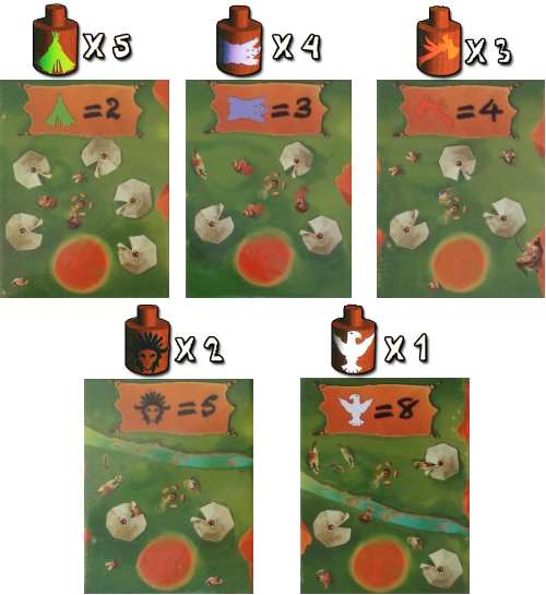 5 villages « standard » Il s’agit des villages rapportant un certain nombre de points pour chaque symbole correspondant sur ses corps de totems. Ce nombre est croissant en fonction de la rareté desdits symboles, pour un potentiel maximum, multiplication faite, compris entre 8 et 12PV selon les cas. Indépendamment de ce chiffre représentant la situation idéale, plus le symbole est rare, plus la prise de risque est généralement élevée. Une dilution des PV potentiels sur un plus grand nombre de corps de totems différents assure un certain minimum : sur le lot, on en aura bien quelques-uns… Autre aspect à prendre en compte : l’adversaire a plus de facilité à me faire déjouer en surveillant de près les quelques symboles à haute valeur dès lors que je m’attribue le village associé. L’exemple extrême est le fameux Aigle, présent en un seul exemplaire : clairement un gros couperet (c’est 8 ou c’est zéro). Le cas particulier du village « Soleil »