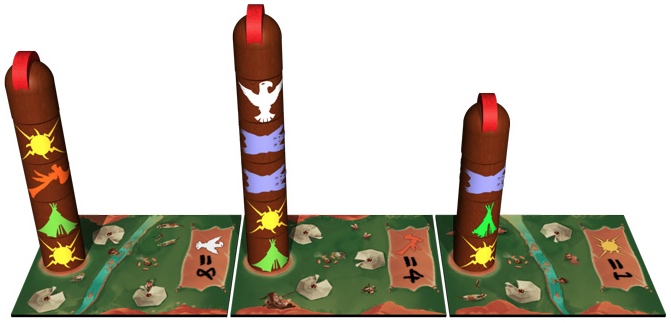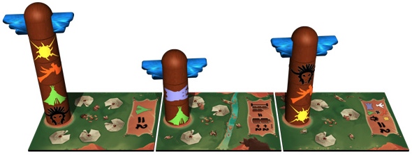 Une fois que tous les totems possèdent une coiffe et que tous les joueurs ont joué leurs corps de totem, on compte les points. C’est là qu’on se rend compte que les corps de totem et les villages ont des correspondances. Enfin, c’est mieux de s’en rendre compte avant quand même (si on a l’ambition de gagner la partie).