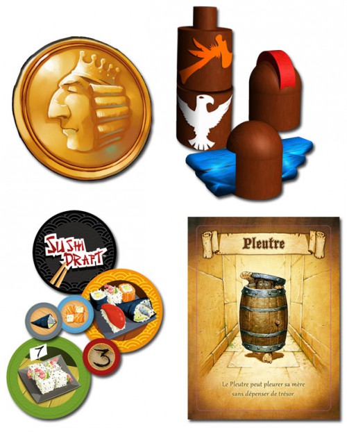 Un jeu de totem donc, mais pas un jungle speed like, non, du tout. En plus il y a des tuiles ici. Et des coiffes. Des coiffes ? Oui, ce sont des petits toits qui vont se mettre en haut de vos totems. Quant au corps emboitables de vos totems, ils sont placés dans un petit sac. Oui au départ, vous n’avez que la coiffe. C’est déjà pas mal.
