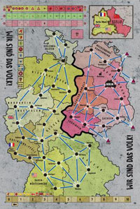 « We are the people » comme vous le savez sûrement, était le slogan des manifestants est-allemands en 89. Il se trouve que notre jeu situe en effet son action dans le flux historique mouvementé de l’Allemagne à partir de « l’année zéro » (1949). Les ruines, la reconstruction, le blocus de Berlin, le pont aérien, the wall, la guerre froide, la crise du pétrole de 73, les Monday Démo de 89 et la chute du mur. Un vrai cours d’histoire, je vous l’avais dit. Mais là, on reprend toutes les cartes -c’est le cas de le dire, puisqu’on est dans un card driven-, et on remet ça. Il s’agit donc en toute logique d’un jeu à deux. L’un va incarner l’Allemagne de l’Est et l’autre sera à l’Ouest -si j’ose dire. La grande question c’est : allez-vous rejouer la construction du mur ? Quel système politique l’emportera cette fois ?
