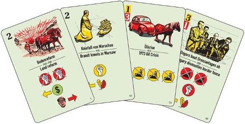 Les cartes montrent donc un événement qui peut être déclenché mais aussi une valeur en points qui pourra être utilisée pour différentes choses. On aura le choix de se mettre un événement positif de côté pour soi-même ou de supprimer un événement positif à l’adversaire. Chaque camps aura ses forces et ses faiblesses basées sur des réalités historiques (coucou la Stasie…).