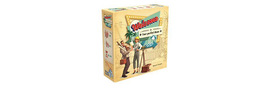 Welcome est un jeu de Benoit Turpin, édité par Blue Cocker et illustré par Anne Heidsieck dans un style rétro qui colle plutôt bien au thème. Nous sommes des architectes dans les années 50 et nous devons ériger le plus beau des quartiers avec des piscines, des parcs et bien sûr des habitations.