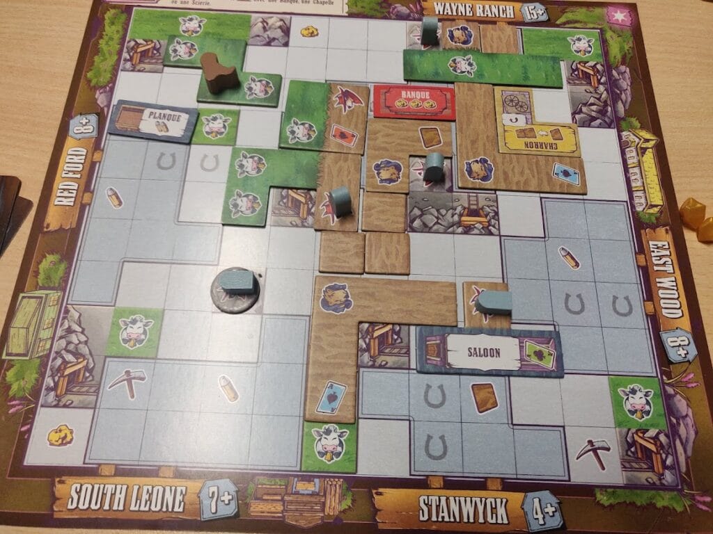 Pour le choix des tuiles de Wild Tiled West, on s’aperçoit vite que l’or est indispensable si on ne veut pas être limité. C’est une notion de gestion des revenus qui apporte un plus par rapport à Planet Unknown. Néanmoins, le dernier joueur se retrouve régulièrement avec un choix extrêmement réduit de tuiles, pouvant ne pas aller du tout dans le sens de sa stratégie.. On fera toujours quelque chose de sa tuile pour compléter une ville ou relier une mine, mais ça pourrait être un choix par défaut.