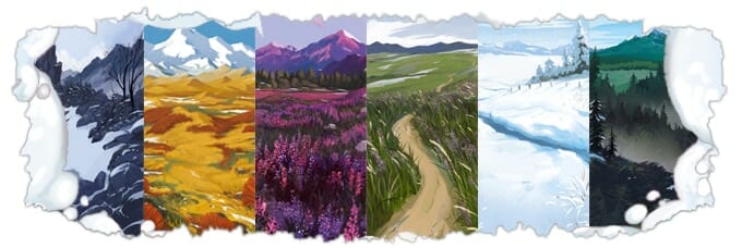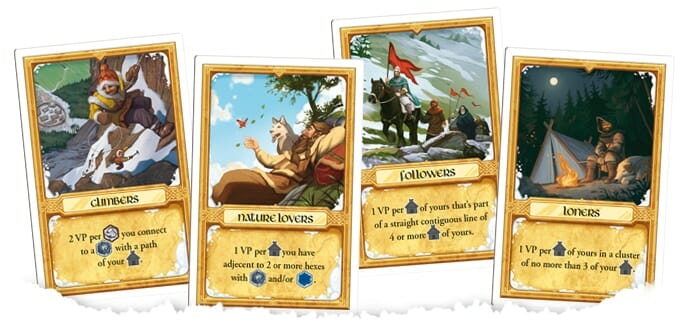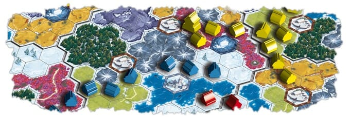 Dans ce « Royaume d’hiver » vous aurez sept tuiles de carte hexagonales à double face, disposées au hasard pour créer la zone de jeu. Ensuite, trois conditions de scoring, une carte Economie (montrant comment les joueurs gagnent de l’argent) et une carte twist sont distribuées, ce qui donne les caractéristiques uniques de la partie. Chaque joueur reçoit aussi cinq cartes de capacité et une carte de terrain.