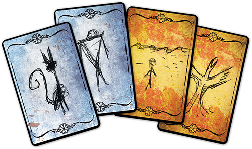 Le mécanisme principal repose sur des cartes de narration illustrées par des enfants de 5 à 9 ans : les dessins sont simples et abstraits (ci-dessous) – et quand un joueur joue une carte de narration, il doit l'interpréter librement afin d'expliquer comment elle intervient dans le cours de l'histoire. Les cartes sont conçues ainsi dans le but d'ouvrir les trappes de l'imaginaire. Un peu comme les papillons chez le psy. Chacun y verra ce qu'il veut. Cela peut être un objet, une sensation, une situation… Sachant qu'une même carte aura une face Printemps et une face Hiver (même illustration, mais fond différent).
