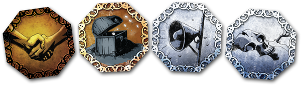 L'autre action possible consiste à résoudre une quête, il suffit pour cela qu'un personnage se trouve sur une case où un jeton Quête est présent… à condition qu'ils soient de la même faction. Mais quand cela a lieu, les autres joueurs ont l'occasion d'intervenir pour rejoindre le pion de la quête en cours, cela leur permettra de rejouer (car même si leur perso est déjà activé, ils pourront le faire jouer là). L'idée c'est d'essayer de remporter la Quête ou d'empêcher l'adversaire de conclure sa mission favorablement. Il conviendra donc de garder un oeil sur les positions de vos persos sur le plateau afin de pouvoir intervenir aux moments opportuns.