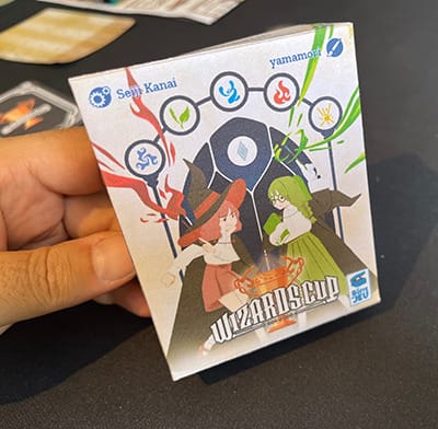 Wizards Cup est un jeu à deux qui se joue en 15 minutes imaginé par Seiji Kanai, l’auteur du hit Love Letter (2012), mais aussi derrière BraveRats, RRR, Lost Legacy et dernièrement Quickshot, paru chez Bankiiiz Editions. Autant dire un amoureux des jeux de cartes basé sur du guessing. C’est encore une fois le cas ici, ajouté à une bonne dose d’auto-battler (mécanique où l’on place ses éléments qui s’affronteront ensuite de façon automatique, comme vous avez pu le voir sur Challengers aka le gagnant du Kennerspiel de l’année dernière).