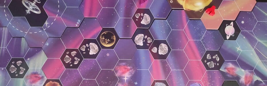 Le plateau modulaire offre pas mal de renouvellement, grâce aux cases spéciales (trou noir, nébuleuse, canon à photons) qui permettent d’accéder à certaines parties plus éloignées du plateau, mais aussi grâce à l’orientation libre des tuiles plateau qui permet de créer une galaxie aux formes fantaisistes. Ça reste quand même un jeu plutôt opportuniste. En fonction des cartes touristes en main et des vortex déjà posés par vous et vos adversaires, il faudra optimiser ses mouvements pour être le plus efficace possible.