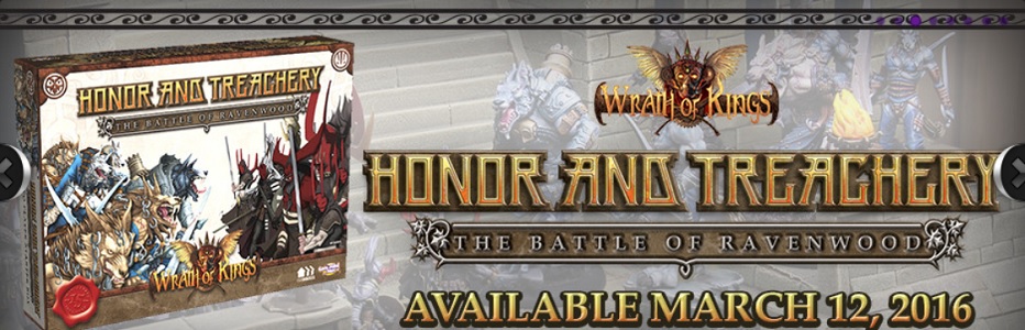 Wrath of Kings est un wargame de chez Cool Mini or Not. Et si jusqu’ici ils suivaient un modèle commercial habituel (et ruineux pour les joueurs, avouons-le avec une larmichette), ils comptent bien changer la donne. Ainsi, le 12 mars 2016 sortira Wrath of Kings: Honor & Treachery – The Battle at Ravenwood. Sous ce titre à la longueur digne des romans du XVIIIe se cache une boîte un peu « starter », idéale pour découvrir l’univers et le gameplay de ce jeu tentaculaire.