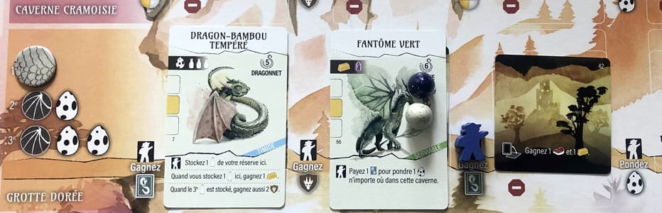 Notre plateau personnel est divisé en trois lignes représentant les habitats de nos dragons ; on ne peut pas placer un dragons dans un habitat qui ne lui correspond pas. Deuxième point, il faut excaver la grotte avant d’y placer un de ces monstres majestueux.