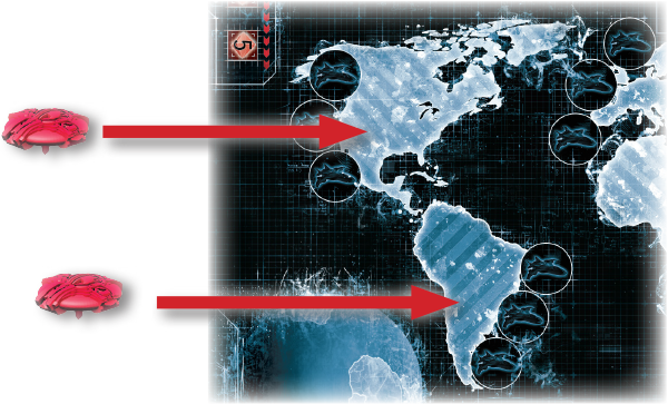 Chaque tour, les ovnis apparaissent en orbite, planant au-dessus des continents de la planète. Si vos intercepteurs ne les éliminent pas, c’est la propagation de la panique à travers les continents qu’ils menacent, POP ! et si deux continents entrent en panique globale, votre organisation perd son financement, vos efforts sont sapés, et vous perdez la partie. Pas glop.