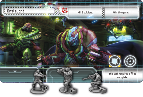 – Chaque succès obtenu par les soldats affectés à une mission ajoute un jeton succès à la mission. Pour accomplir une mission, les soldats doivent remplir trois tâches, dont chacune nécessite des soldats pour gagner un certain nombre de jetons de succès.