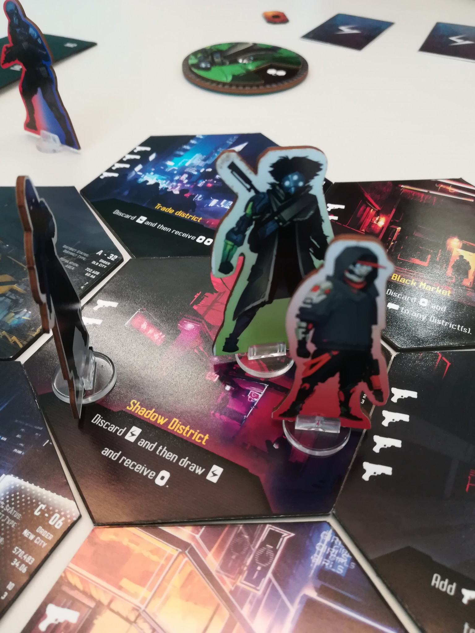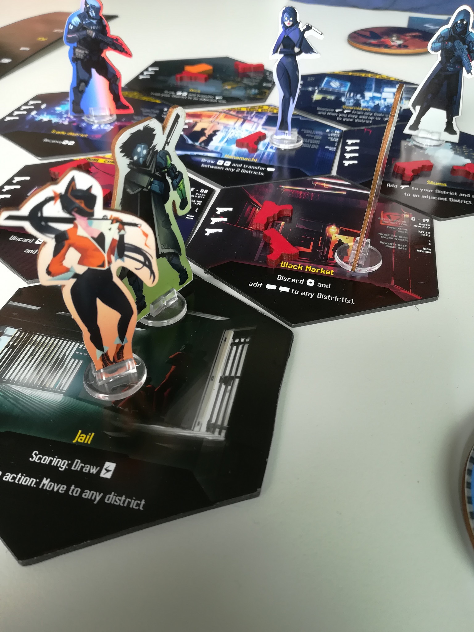 Pour augmenter notre réputation, nos avatars vont devoir se déplacer de quartier en quartier pour augmenter leur niveau de criminalité. Ainsi, des marqueurs « crime » et « rumeurs » vont être placés sur les tuiles quartier.