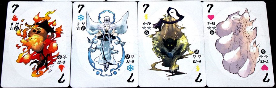 Dans la nouvelle thématique du jeu, les 7 représentent des Yokais, ces monstres japonais qui hantent mes jours et mes nuits, tant je suis fasciné par leurs origines, leurs demandes, leurs pouvoirs et le moyen de leur survivre. Autant vous dire qu’un jeu de trick-taking dans l’univers des 妖怪, des Yokais, je suis comblé !