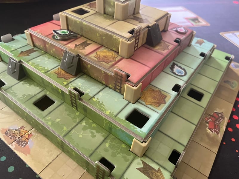 La structure en trois dimensions est bien exploitée par les auteurs. Avec cette ascension et ces chutes, on pense un peu à L’ile Infernale, que Rob Daviau a d’ailleurs remis au gout du jour en 2018. Dans Ziggurat, nous avons des échelles qui nous permettent de monter à l’étage suivant (mais les flammes aussi !) et des pentes qui vont nous faire glisser à l’étage en dessous (mais les flammes aussi…). On peut perdre la partie si une flamme arrive tout en haut avant nous. En avançant dans l’histoire, on découvrira de nouvelles applications à cette structure, mais je n’en dis pas plus ! 🙂