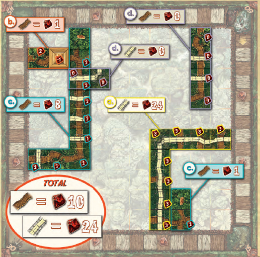 Si un sentier touche au moins un des 4 bords de la jungle, on attribue des diamants par carré de la façon suivante :