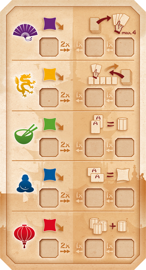– Le pouvoir de Buddha (bleu) se révèle utile quand vous construisez un étage ou un toit, à ce moment-là, vous pouvez utiliser 2 cartes d’une couleur similaire pour jouer la tuile de votre choix.