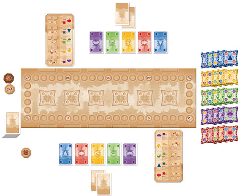 Vous mettez aussi tous les petits cylindres en bois de couleur (les colonnes) pas trop loin. Enfin, on se munit d’une carte de chaque couleur : violet, vert, jaune, rouge et une bleu que l’on pose les unes à côté des autres devant soi face visible, et on termine tout ça en piochant chacun 2 cartes, qui iront cette fois constituer notre main. En fait, les 2 cartes en main et les 5 autres visibles forment votre réserve de cartes – mais comme vous l’aurez compris, certaines sont connues de votre adversaire et d’autres non…