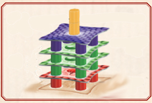 Sur le plateau central, vous avez 6 emplacements de construction qui pourront accueillir chacune une pagode à plusieurs étages. Chaque étage, à commencer par le sol (considéré comme le 1er étage) comporte 4 colonnes d’une même couleur. Chaque étage est séparé par une tuile, qui présente des espaces pour les futures colonnes.
