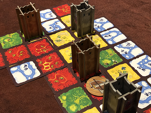 Vous voyez qu’il y a déjà pas mal d’interactions directes, mais ce n’est pas tout. À chaque tour, on devra poser une carte terrain ; vous allez agrandir la surface de jeu en ayant au moins 1 des 4 terrains présents sur la carte adjacent à un terrain du même type déjà posé (façon Domino). Mais on peut aussi attaquer plus frontalement en posant notre carte de façon à recouvrir un type de terrain déjà en place, ce qui aura pour effet d’amoindrir un fief. Ouh c’est méchant !